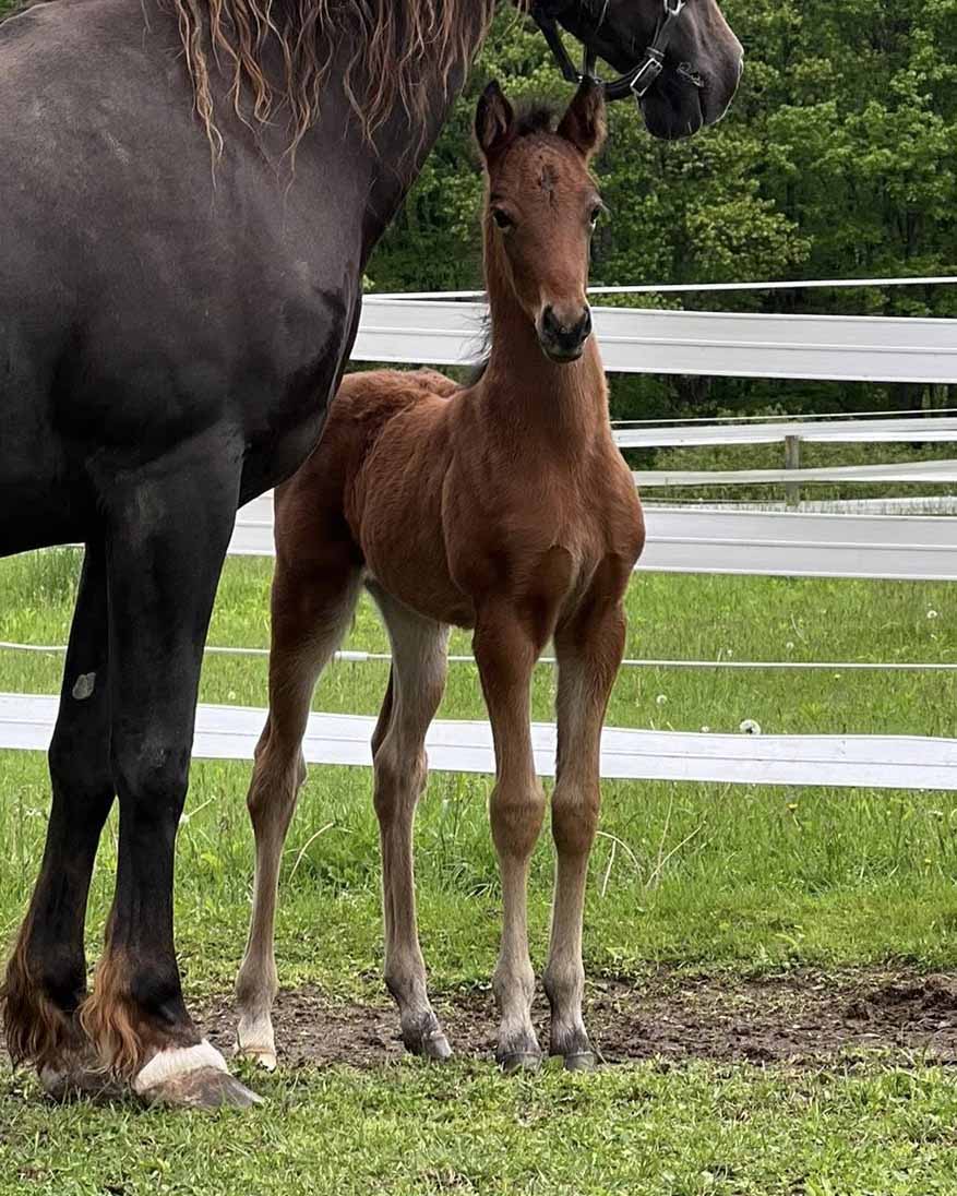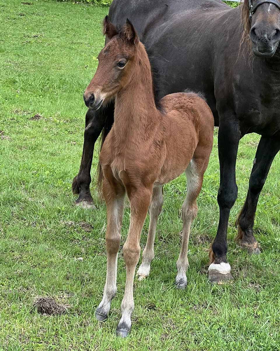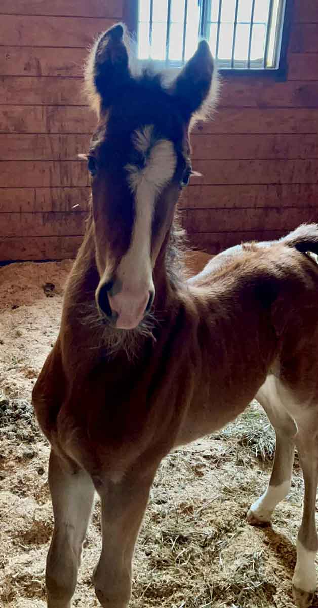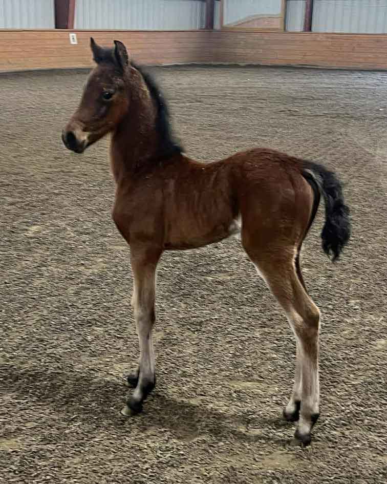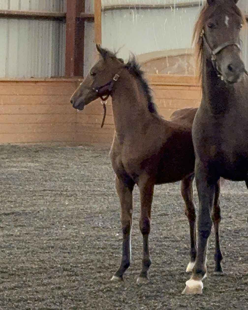 His first foals arrived in 2024 and we were impressed with their natural upright necksets and extreme tipover at the poll. Few horses standing today express the vertical, uphill frame that this young stallion exhibits.
