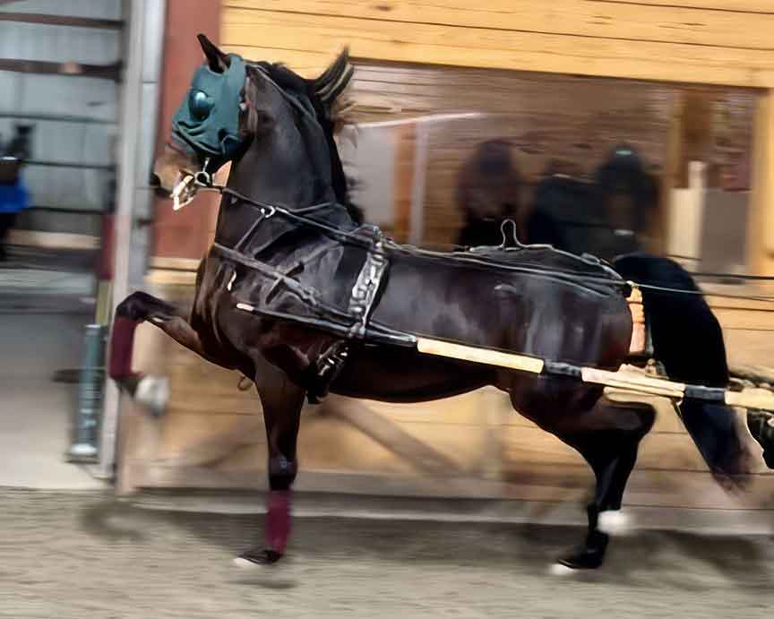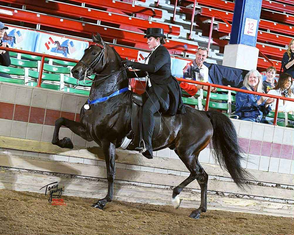 The recently crowned Reserve World Champion Stallion, and a consistent winner in park harness, this elegant young stallion possesses beauty and refinement with a laid back shoulder.