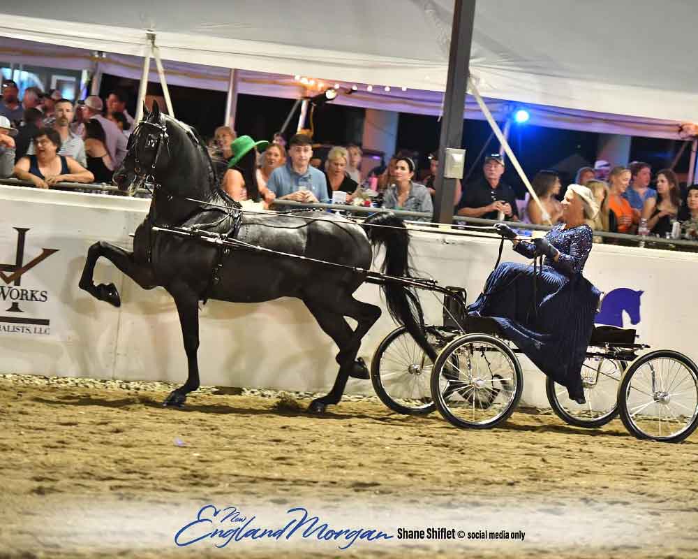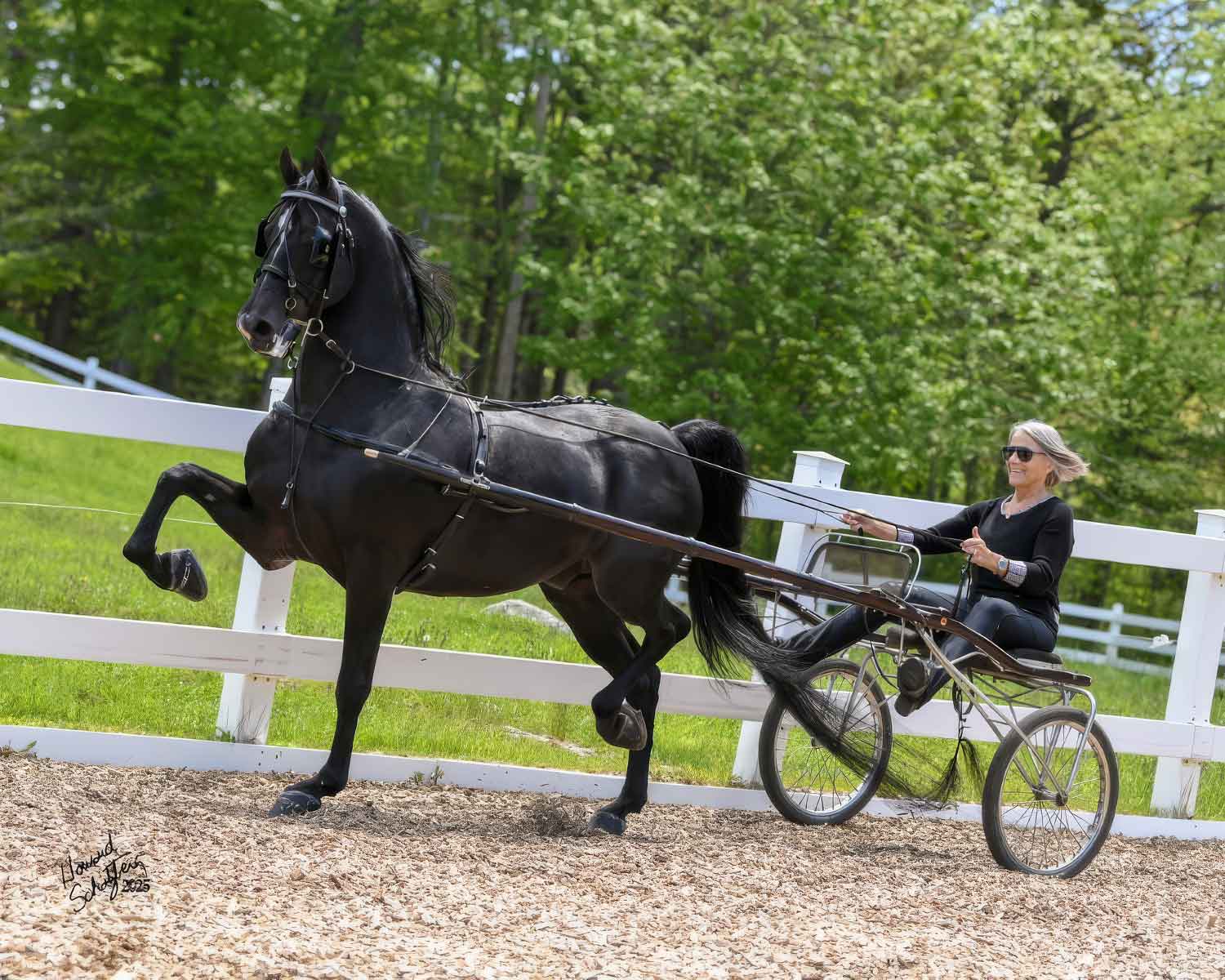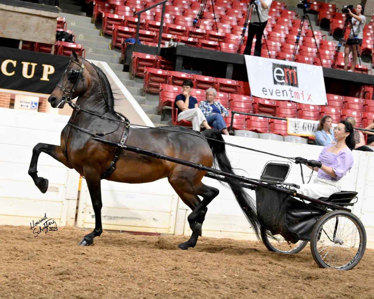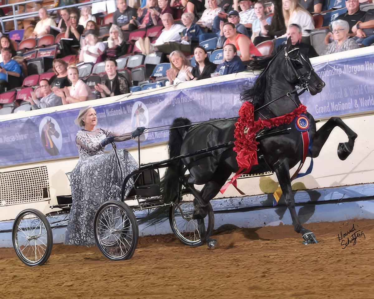 This talented and beautiful Morgan has conquered every division with ease, from in hand and park harness to park saddle, with World Champion titles in all three divisions, including open and amateur harness. His most recent world title was the highlight of his career for his owner, Dr. Grace Steere, who was on the lines for this electrifying performance as the 2025 Park Harness World Champion. This historic achievement made him one of only two living horses to win both the Park Saddle and Park Harness World Championships.