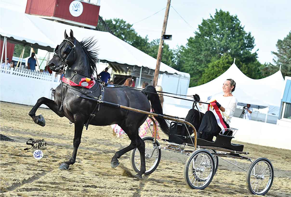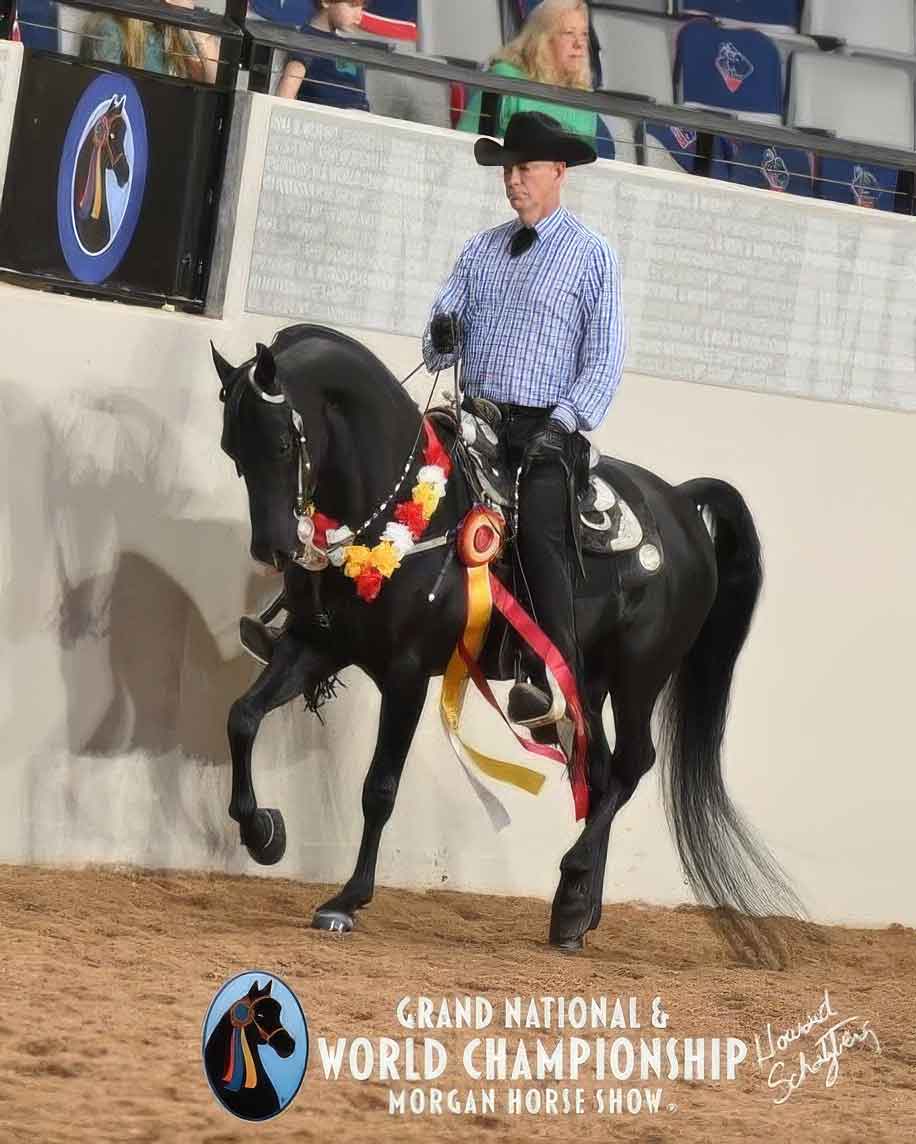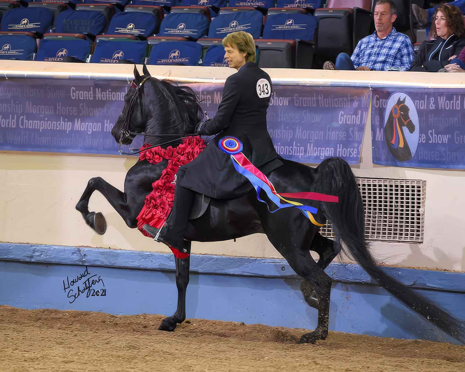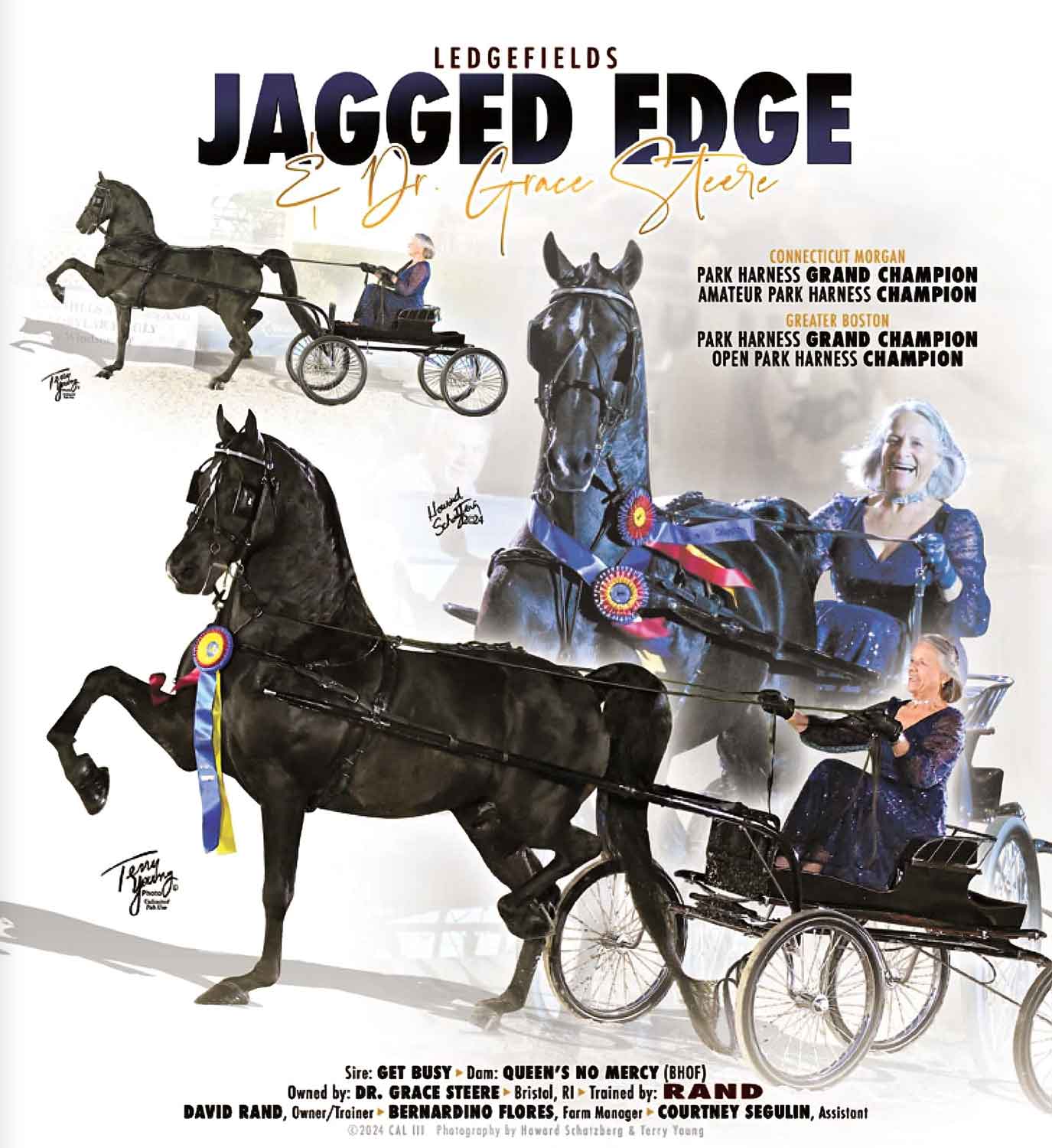 This talented and beautiful Morgan has conquered every division with ease, from in hand and park harness to park saddle, with World Champion titles in all three divisions, including open and amateur harness. His most recent world title was the highlight of his career for his owner, Dr. Grace Steere, who was on the lines for this electrifying performance as the 2025 Park Harness World Champion. This historic achievement made him one of only two living horses to win both the Park Saddle and Park Harness World Championships.